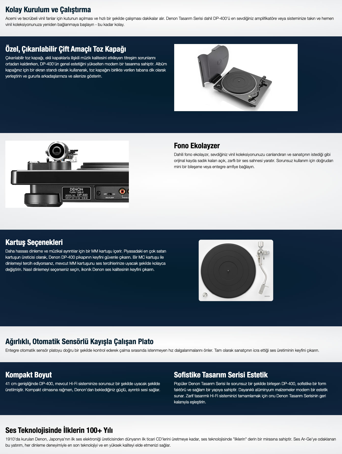Denon DP-400, güçlü, sofistike tasarımı ve otomatik kaldırma ve oynatma durdurma özelliğine sahip yeniden yapılandırılmış tonearmiyle orijinal kayda sadık değerli albümleri çalar