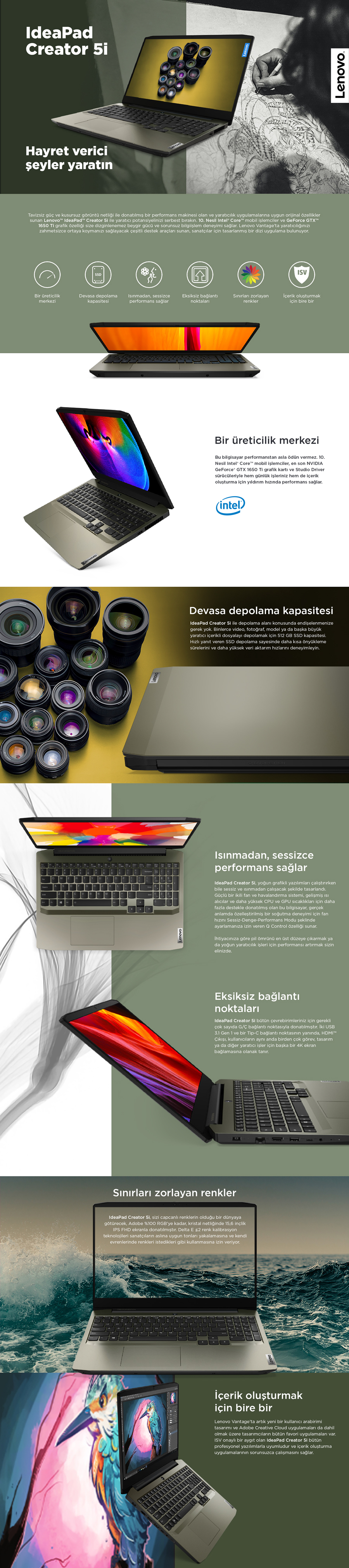 Lenovo IdeaPad Creator 5 Intel Core i5 10300H 16GB 512GB SSD GTX 1650Ti Freedos 15.6'' FHD Taşınabilir Bilgisayar 82D4002KTX