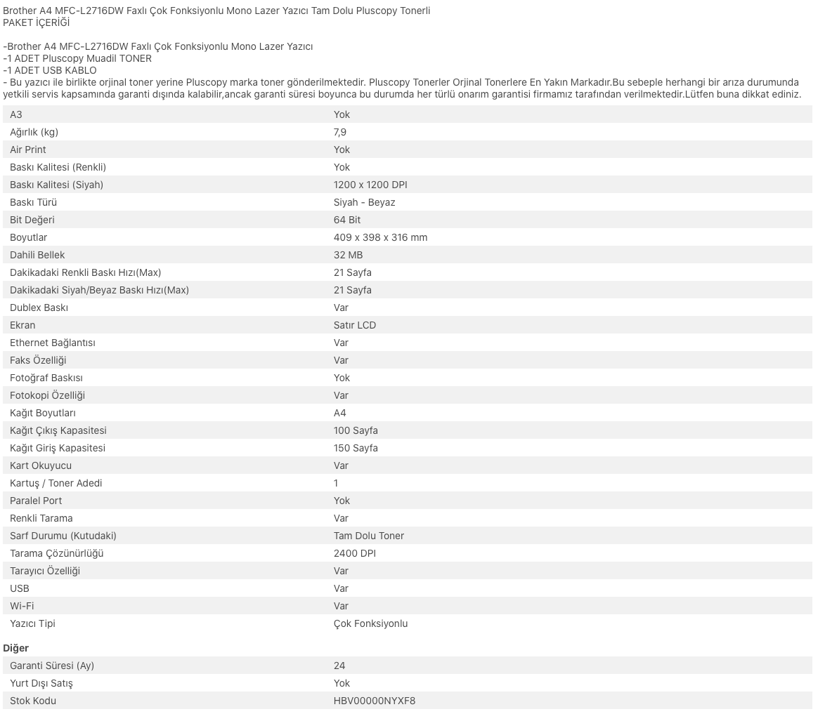Brother A4 MFC-L2716DW Faxlı Çok Fonksiyonlu Mono Lazer Yazıcı